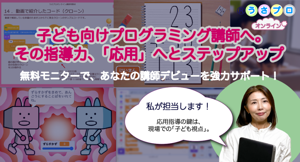 | 基礎力養成編② (無料モニター) | 応用テーマ指導法(メッセージ、リスト、クローンなど)を習得。 養成編①修了者向け。 | 無料 (通常13,800円) | 11月29日(土) 13:00~16:00 |